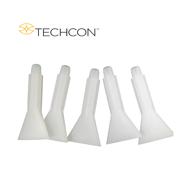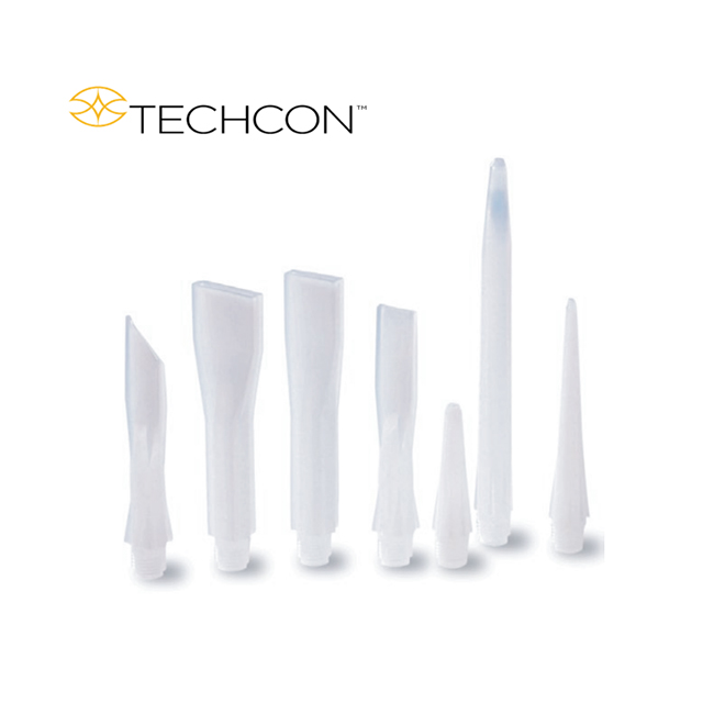 胶嘴和点胶口转接头的应用广泛,标准胶嘴可通过切割增加孔径。 点胶口转接头这些转接头的一端为标准1/4英寸NPT外螺纹,适配所有TechconSystems卡式胶筒和相关产品;另一端为标准的鲁尔外螺纹,适配所有鲁尔接口的点胶针头。